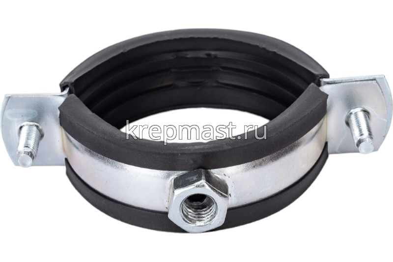 Хомут сантехнический с гайкой 54-58 мм представляет собой две металлические пластины, соединенные по краям регулировочными винтами м6 и резиновым уплотнителем. К хомуту приварена гайка м8 с метрической резьбой. Диаметр обжима трубы составляет от 54 до 58 мм. Изготавливается из оцинкованной стали толщиной 1.2 мм.