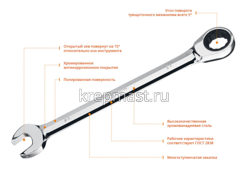Комбинированный гаечный трещоточный ключ 27 мм Зубр позволяет вращать крепеж с минимальным углом 5 градусов.
