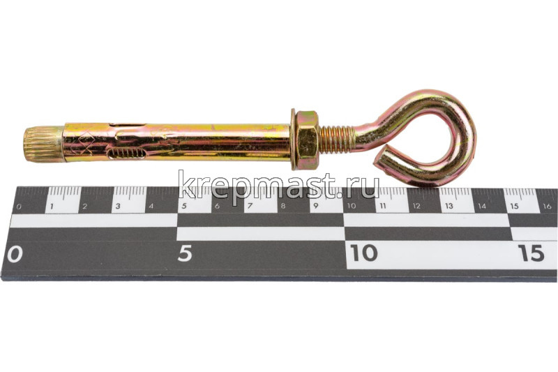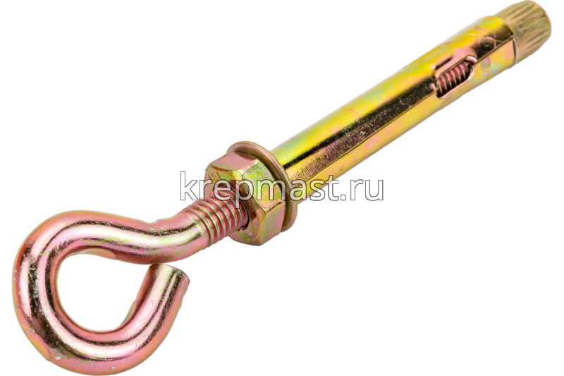 Анкерный болт с кольцом 12 х 100 является элементом крепежа для фиксации тяжелых подвесных конструкций, соединения с тросами и цепями.