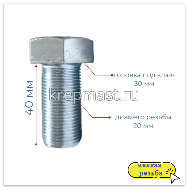 Болт DIN 961 20х 40х1,5 кл.пр. 10,9 ОЦИНК. п/р с мелкой резьбой в интернет-магазине «Мастер Крепежа» по цене 390 руб. Более 6 наименований товаров в наличии в категории Болты 20мм с мелкой резьбой. Купить болт din 961 20х 40х1,5 кл.пр. 10,9 оцинк. п/р с мелкой резьбой в Зеленодольске выгодно Вы можете on-line на нашем сайте, или отправив заявку по почте, а также по телефону или в пункте выдачи компании г. Казань, ул. Татарстан, 9, магазин "Мастер Крепежа". Доставка по Республике Татарстан и другие регионы РФ.