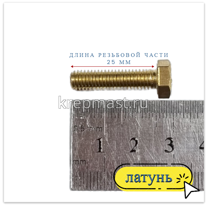 Болт 6х25 DIN 933 латунь в интернет-магазине «Мастер Крепежа» по цене 53 руб. Более 26 наименований товаров в наличии в категории Болты латунные DIN 933. Купить болт 6х25 din 933 латунь в Зеленодольске выгодно Вы можете on-line на нашем сайте, или отправив заявку по почте, а также по телефону или в пункте выдачи компании г. Казань, ул. Татарстан, 9, магазин "Мастер Крепежа". Доставка по Республике Татарстан и другие регионы РФ.