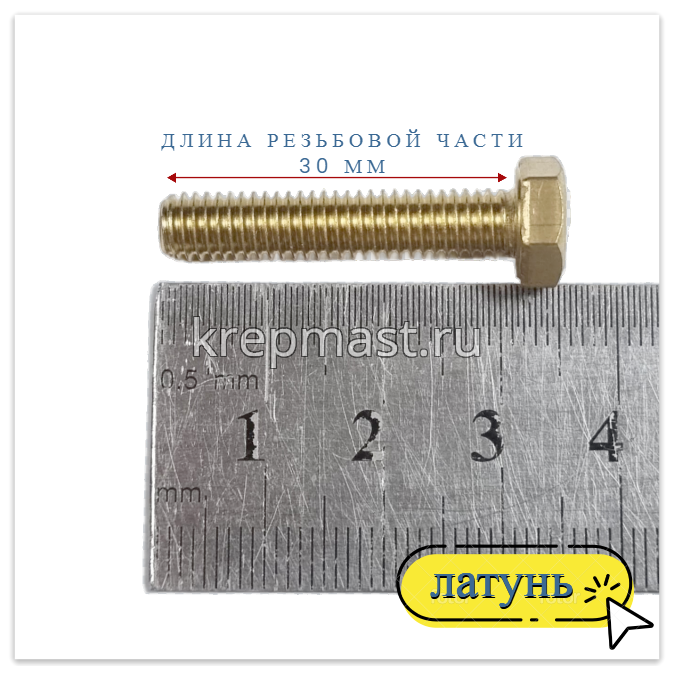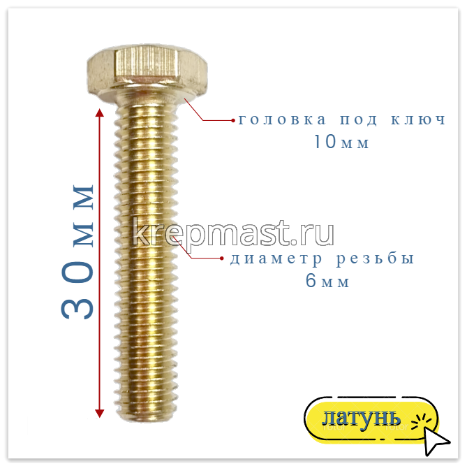 Болт 6х30 DIN 933 латунь в интернет-магазине «Мастер Крепежа» по цене 61 руб. Более 26 наименований товаров в наличии в категории Болты латунные DIN 933. Купить болт 6х30 din 933 латунь в Зеленодольске выгодно Вы можете on-line на нашем сайте, или отправив заявку по почте, а также по телефону или в пункте выдачи компании г. Казань, ул. Татарстан, 9, магазин "Мастер Крепежа". Доставка по Республике Татарстан и другие регионы РФ.