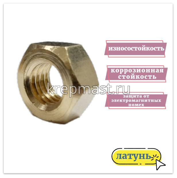 Гайка латунная не магнитится и служит для создания разъемных резьбовых соединений совместно с винтами, шпильками и болтами.