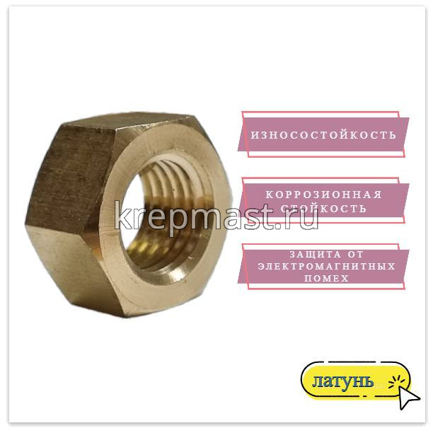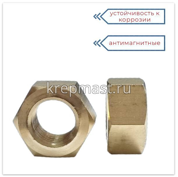 Шестигранная латунная гайка М 16 DIN 934/ ГОСТ 5927 применяется в приборостроении, авиации, атомной промышленности. Латунный крепеж стоек к органическим кислотам и углекислым растворам.