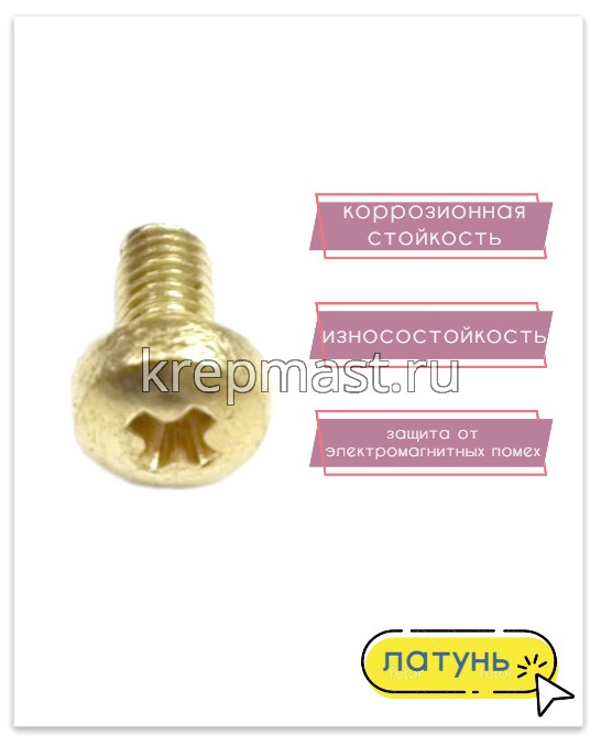 Винт латунный с полукруглой головкой DIN 7985 / ГОСТ 17475 М 3 х 6 используется в случае, когда необходимо создать немагнитный узел. Латунный винт применяется в приборостроении, авиации, атомной промышленности. Латунный крепеж стоек к органическим кислотам и углекислым растворам.