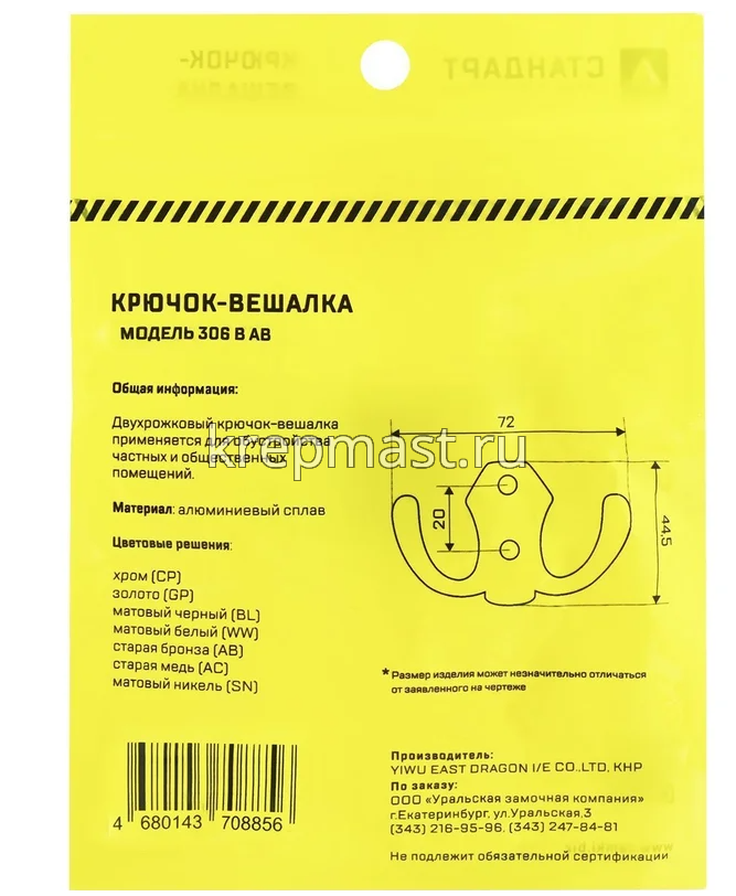 Крючок 306 В СР хром СТАНДАРТ в интернет-магазине «Мастер Крепежа» по цене 120 руб. Более 12 наименований товаров в наличии в категории Крючок-вешалка. Купить крючок 306 в ср хром стандарт в Зеленодольске выгодно Вы можете on-line на нашем сайте, или отправив заявку по почте, а также по телефону или в пункте выдачи компании г. Казань, ул. Татарстан, 9, магазин "Мастер Крепежа". Доставка по Республике Татарстан и другие регионы РФ.