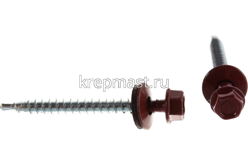 Кровельный саморез окрашенный с шайбой и резиновой прокладкой EPDM DIN 7504 4,8 х 51 по дереву RAL 3011 (цвет красный) - представляет из себя саморез с шестигранной головкой, фланцем и резиновой прокладкой для эффективного прижатия листового металла к основанию.