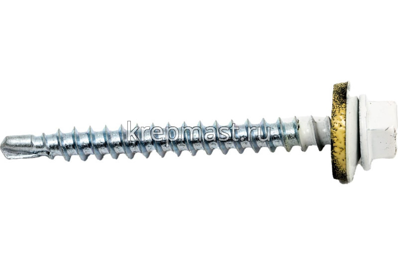 Кровельный саморез окрашенный с шайбой и резиновой прокладкой EPDM DIN 7504 4,8 х 51 по дереву RAL 9003 (цвет белый ) - представляет из себя саморез с шестигранной головкой, фланцем и резиновой прокладкой для эффективного прижатия листового металла к основанию.