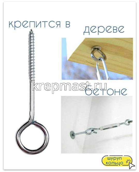 Шуруп-кольцо 8,0 х 80,0 применяется для монтажа в бетонные и кирпичные основания с помощью пластиковых дюбелей, а также в деревянные конструкции, в предварительно просверленное отверстие. Шуруп-кольцо используется для монтажа тросов и канатов, фиксации легких строительных лесов и стеллажей к стенам, а также для подвешивания предметов к потолку и стенам.