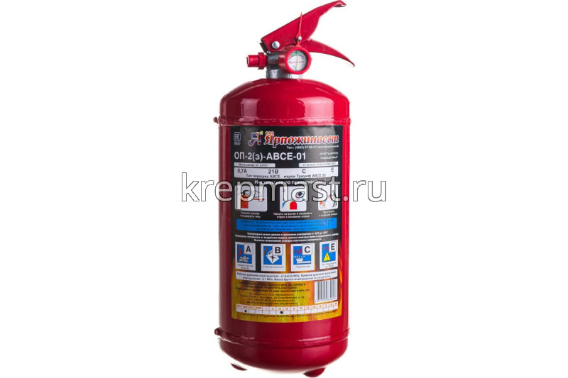 Огнетушитель Ярпожинвест ОП-2 з АВСЕ служит для тушения пожаров при возгорании твердых, жидких и газообразных горючих веществ. Также огнетушитель подходит для тушения электроприборов, находящихся под напряжением до 1000 В. Изделие широко применяется для оборудования складов, предприятий, мастерских, офисов и т. д.